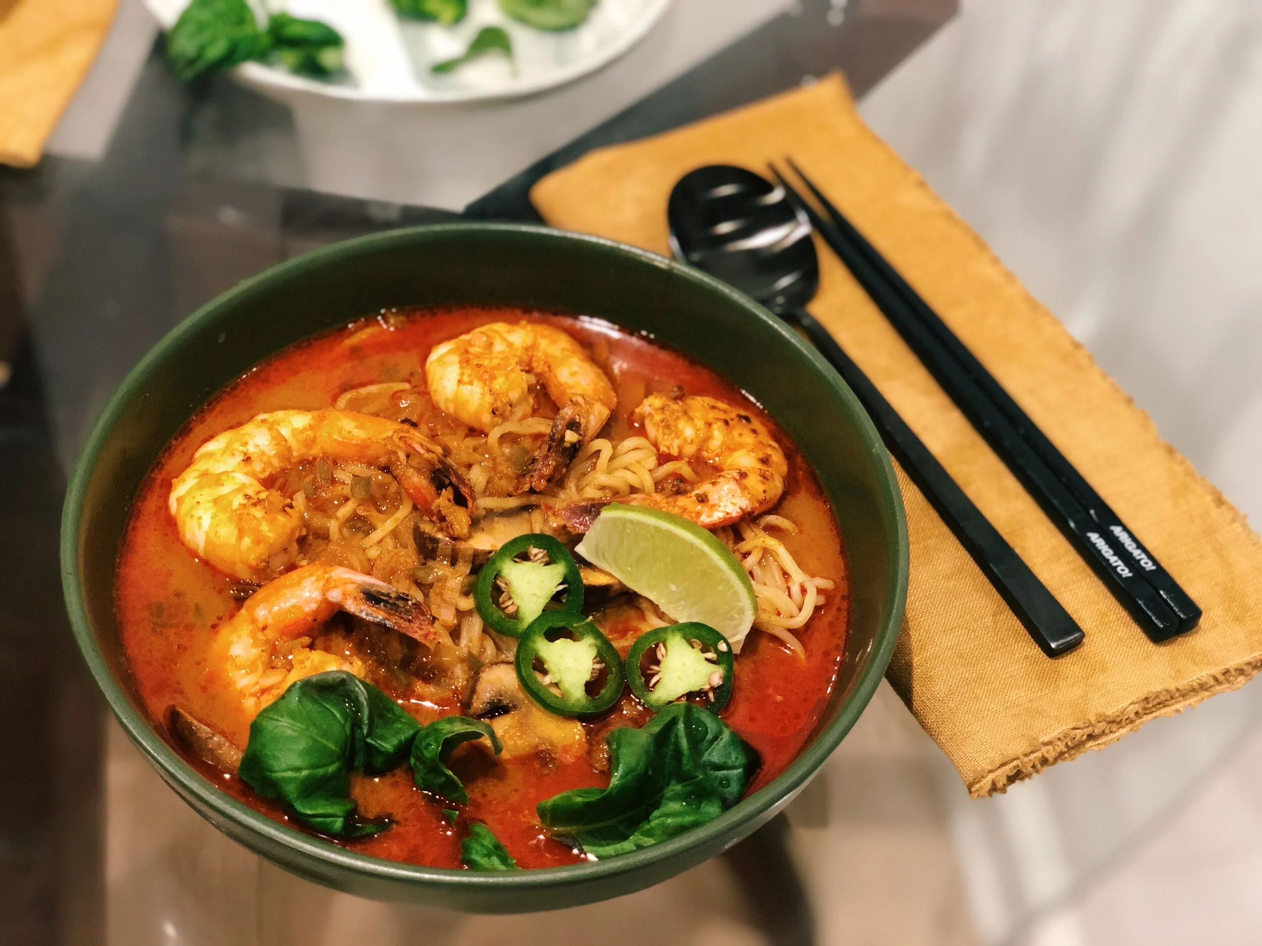 Nevertheless, captivity has emboldened (or addled) me, and this weekend I made one of my favorite things: Laksa Lemak, or Singaporean / Malaysian curried soup noodles. I make no claims to authenticity here, but the basic premise is a rich coconut curry broth topped with tofu and seafood. I didn’t have nearly the full array of ingredients, but that didn’t stop me and it shouldn’t stop you!